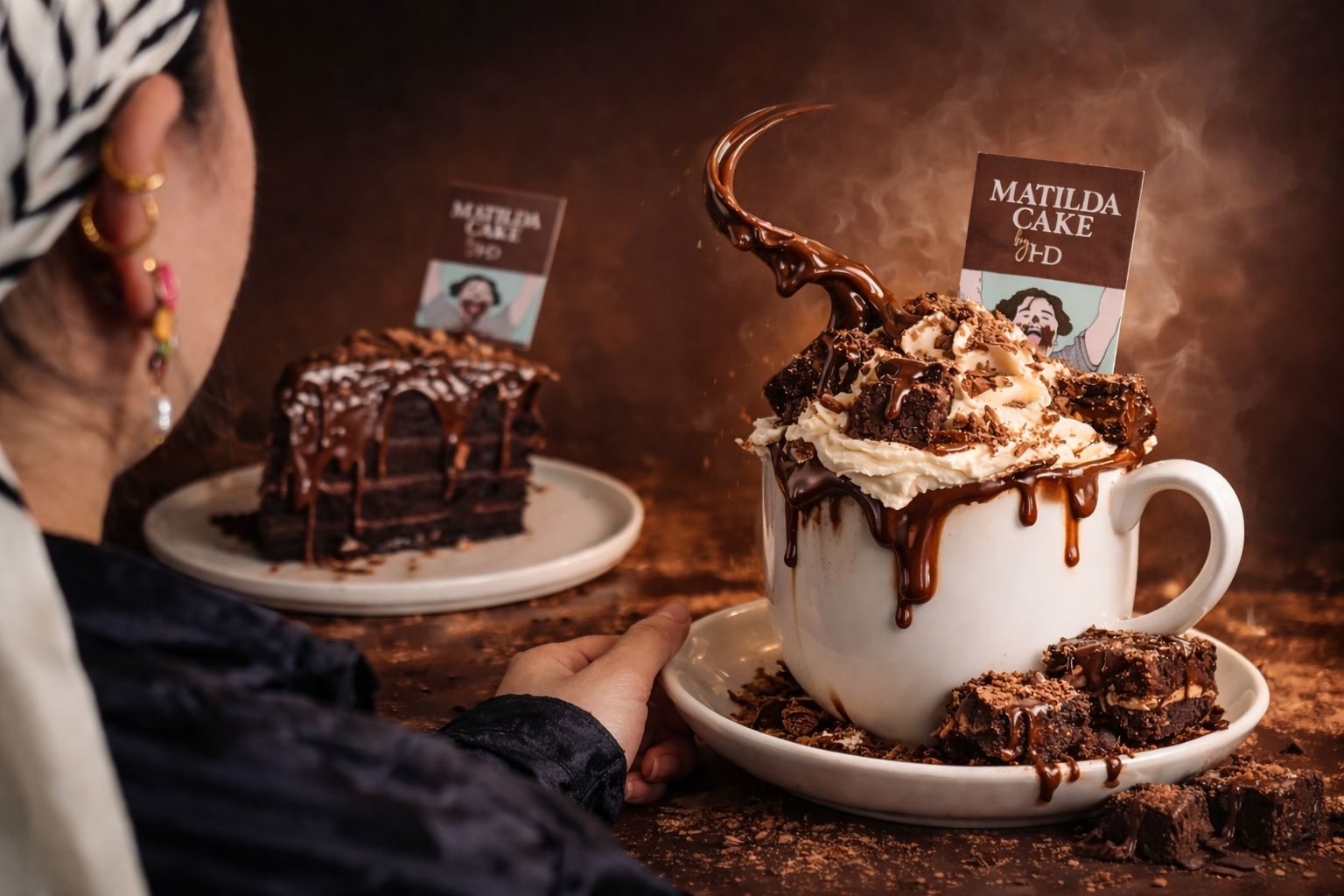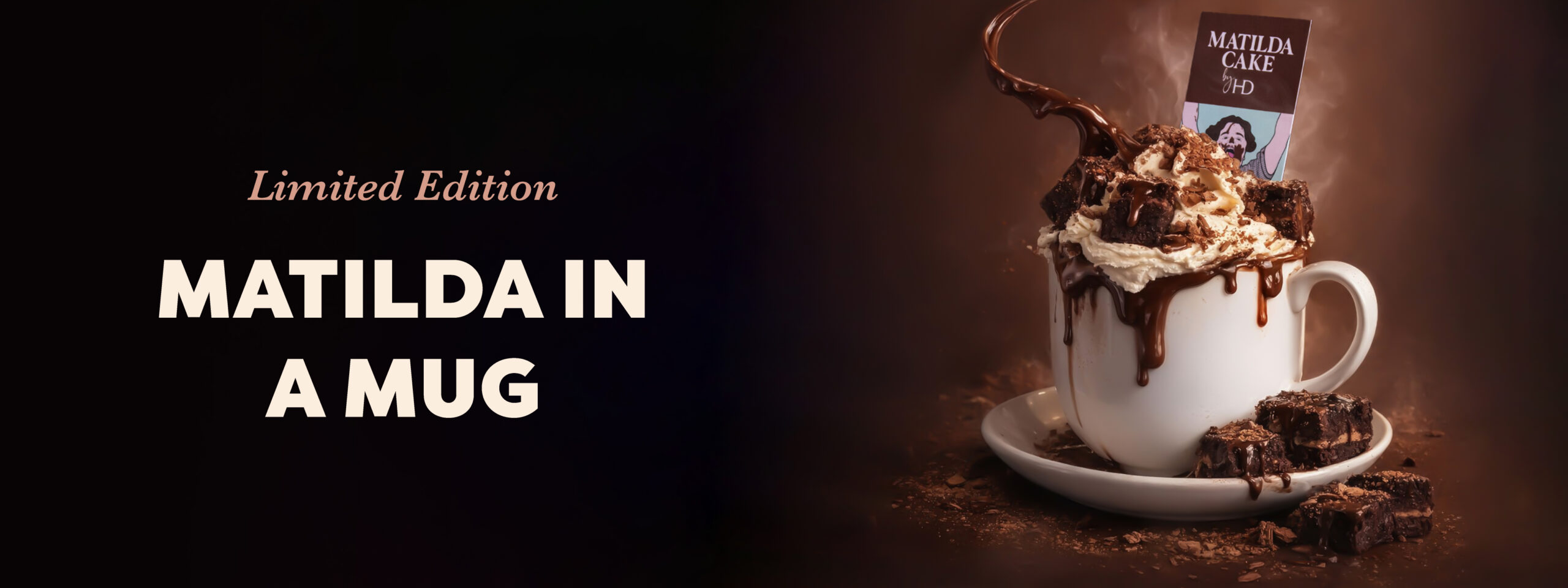 The Matilda Hot Chocolate is inspired by Matilda Cake by HD — the dessert our customers come back for time and time again. Rich chocolate sponge layered with smooth ganache, finished generously, and widely known as the Matilda Cake worth travelling for.