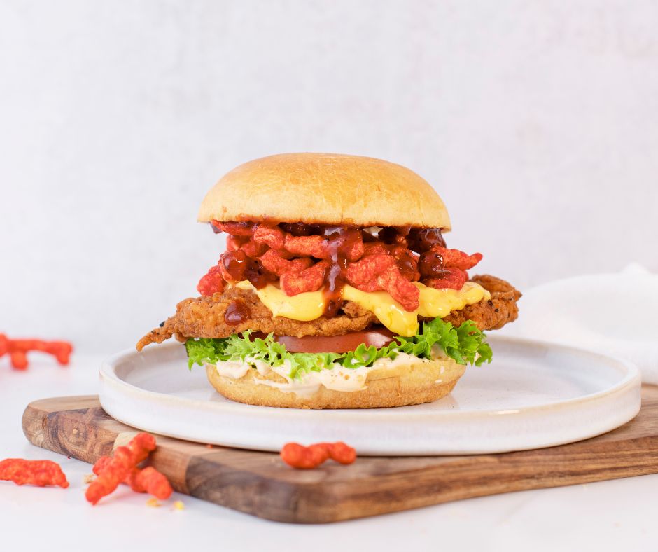 Crispy fried chicken topped with lettuce, red onions, tomatoes, melted Monterey Jack, crunchy Cheetos, chilli sauce, cheese sauce and our signature sauce.