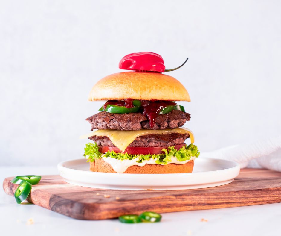 A juicy Angus beef patty loaded with jalapeños, lettuce, tomatoes, caramelised onions, melted Monterey Jack, chilli sauce, IceBurg sauce, Scotch bonnet heat, and a finishing touch of Magic Salt.