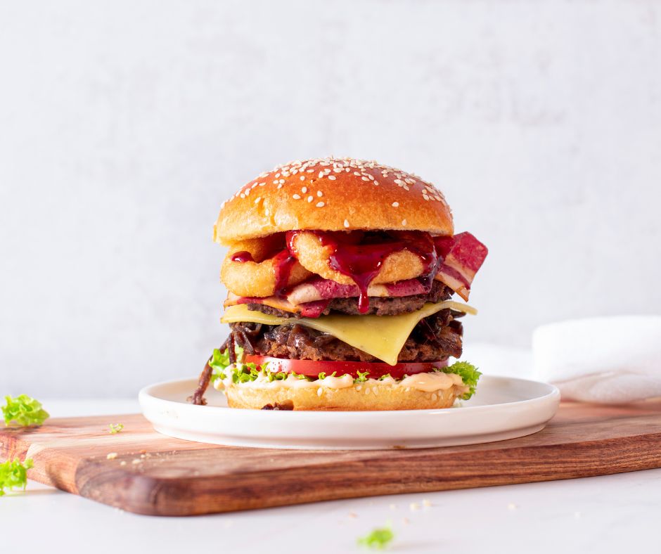 A juicy Smokin’ Angus beef patty stacked with lettuce, tomatoes, beef rashers, caramelised onions, onion rings, melted Monterey Jack, BBQ sauce, IceBurg sauce, and a sprinkle of Magic Salt.